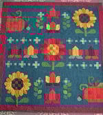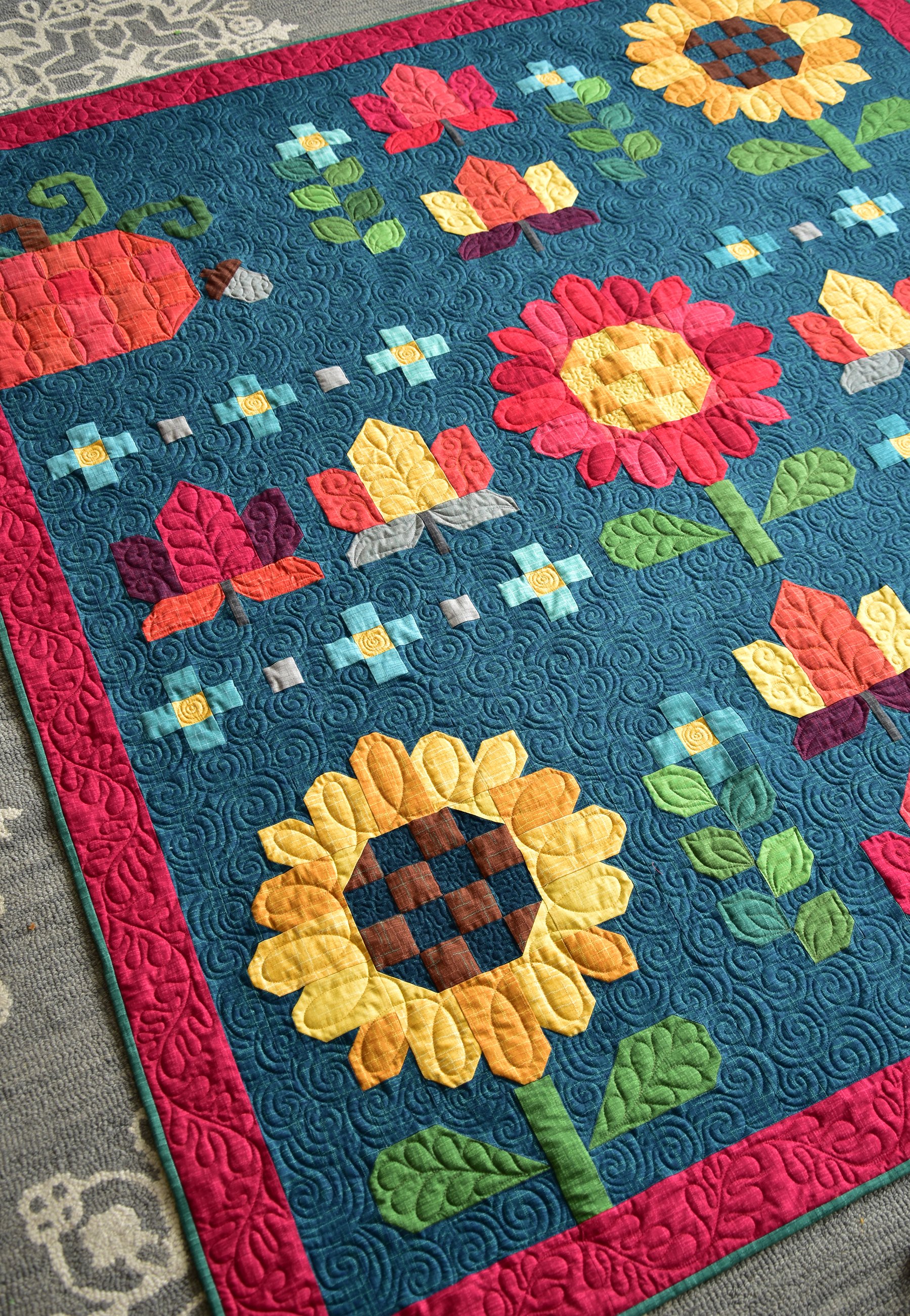 Autumn Afternoon Sampler quilt made in the Grasscloth Cottons collection by Heather Peterson for Riley Blake Designs. Custom machine quilted with lots of detail! Heirloom Cotton batting. Hand stitched binding. Includes a hanging sleeve.