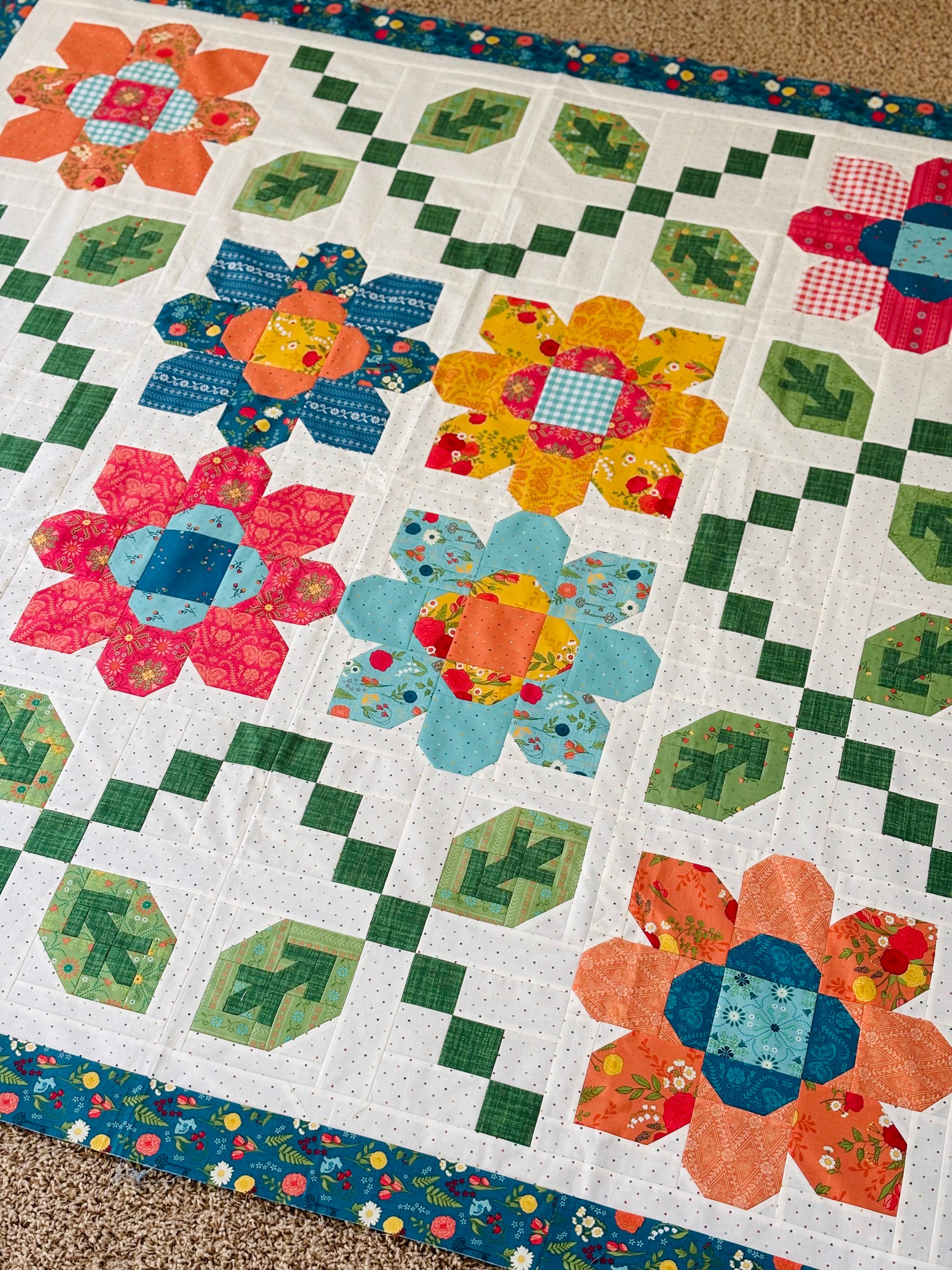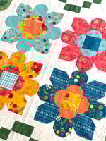 This kit comes with all the fabric needed to make the quilt top, including 10" squares for the flowers and leaves, plus background, border and binding fabric. The kit features the fabric from the First Blooms collection by Heather Peterson for Riley Blake Designs. Different border options are available upon request if you prefer a different print from the collection. Please add a note in the comment section of the order form that includes which print you would like.