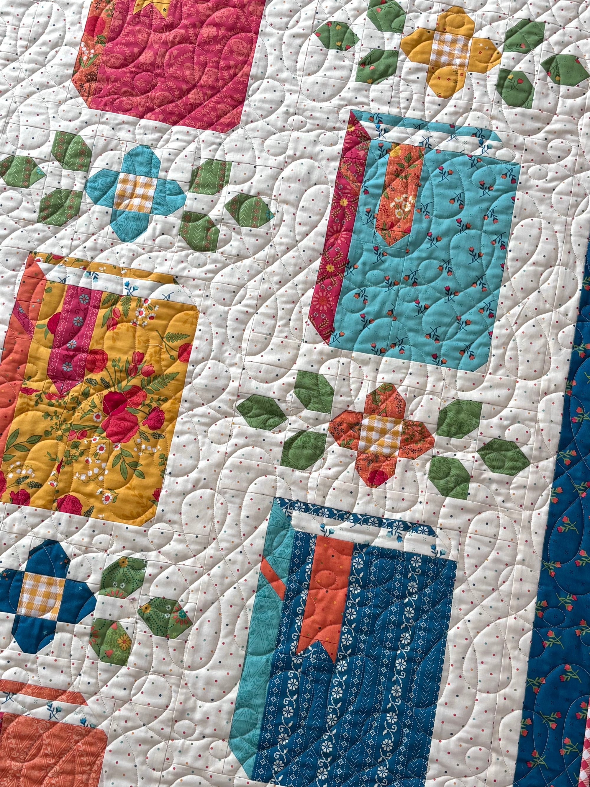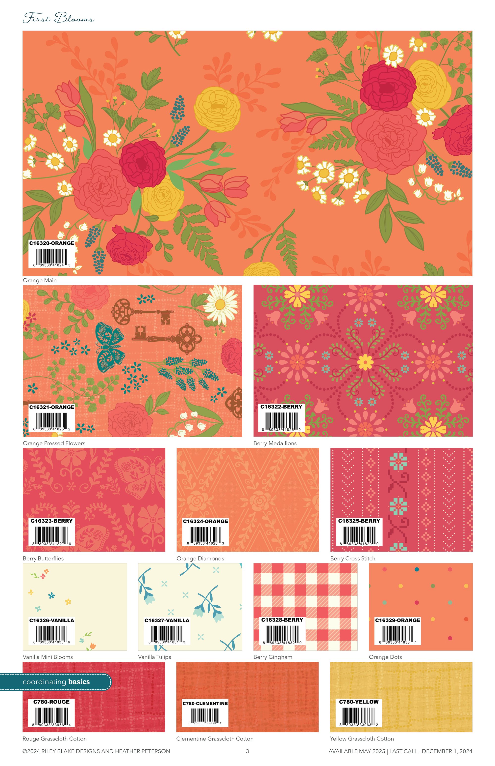 This kit features the First Blooms collection by Heather Peterson for Riley Blake Designs. The kit includes fabric for the quilt top - including 21 - 10" squares, plus yardage for the background, borders and binding.