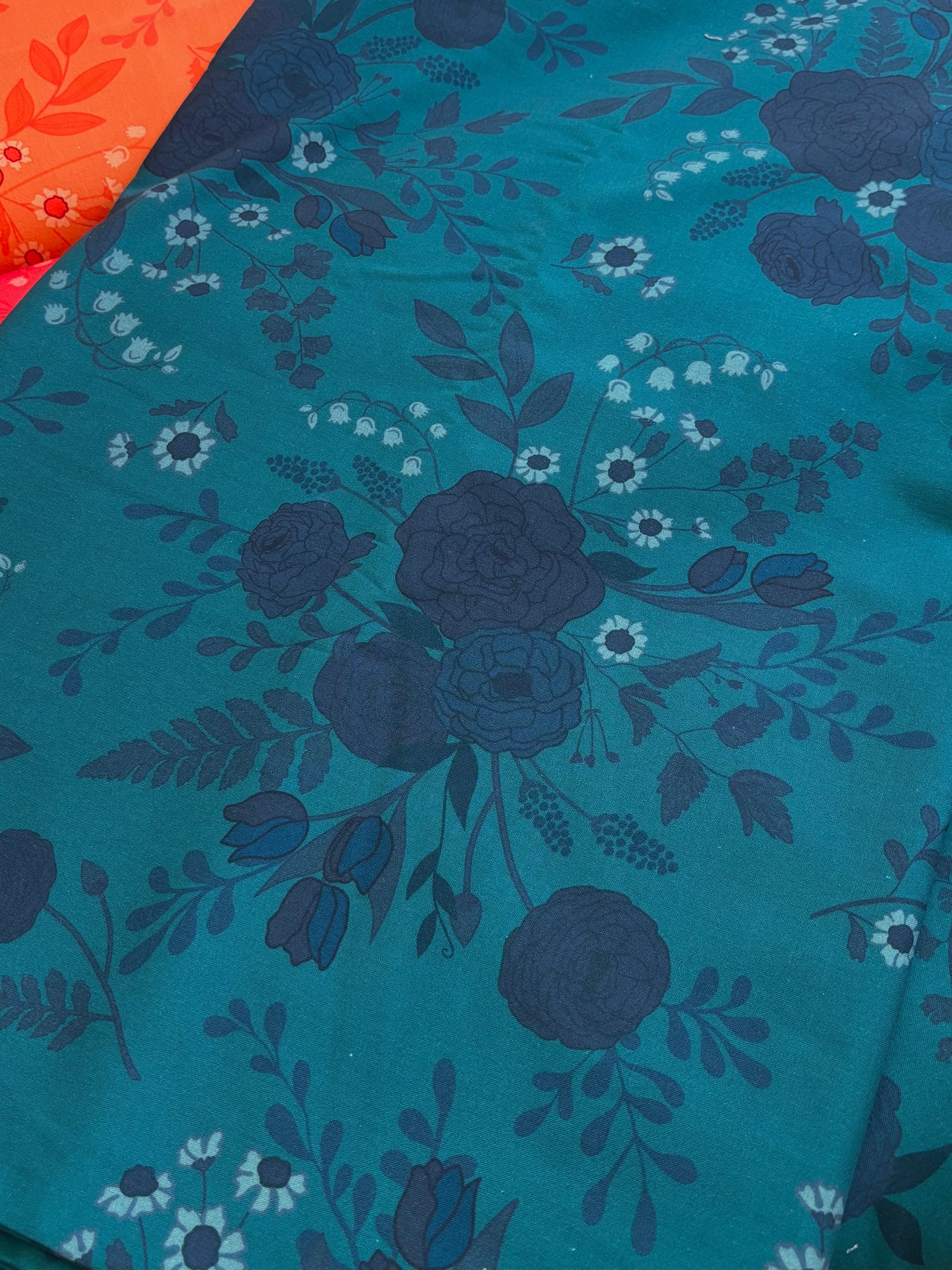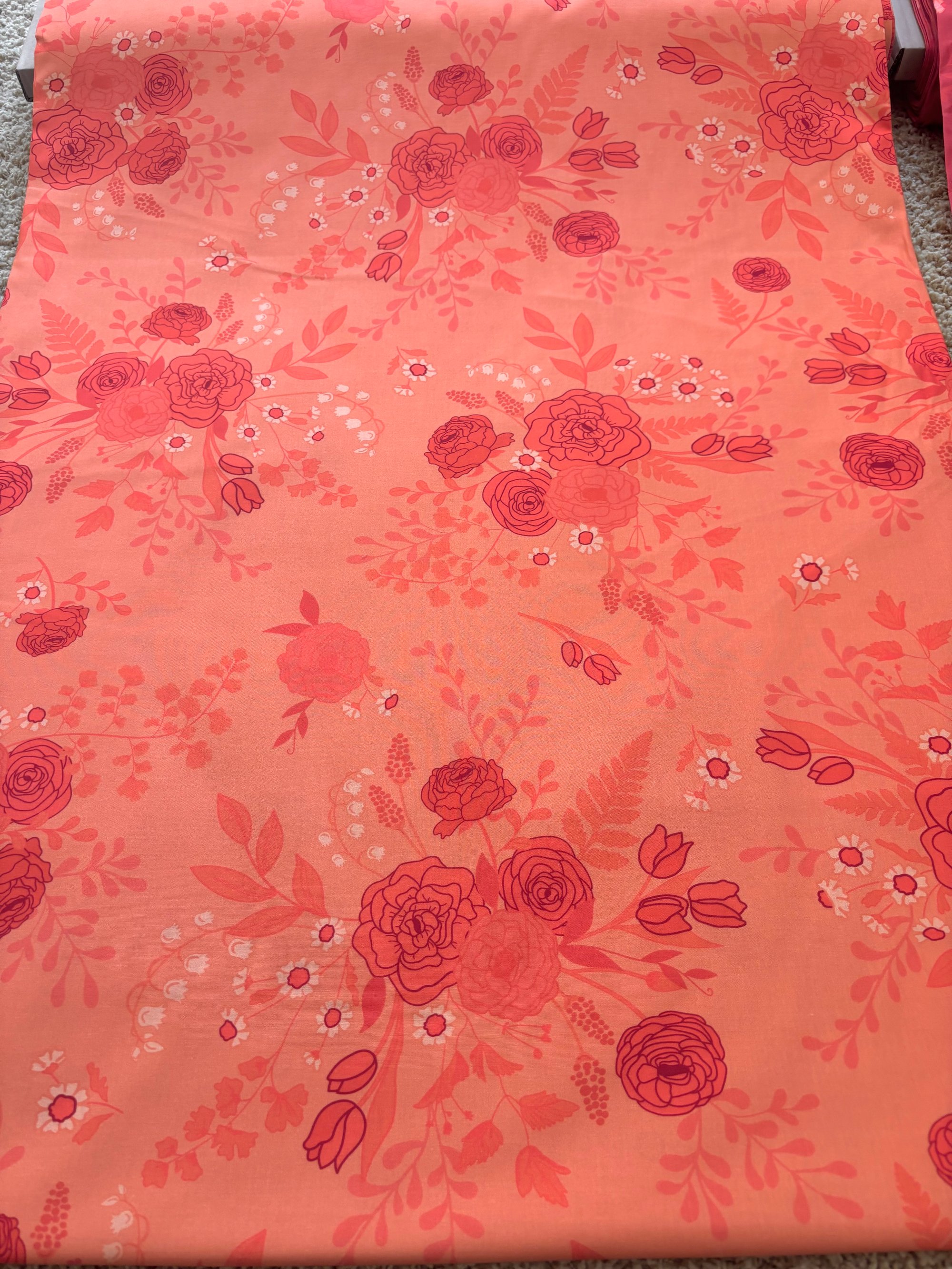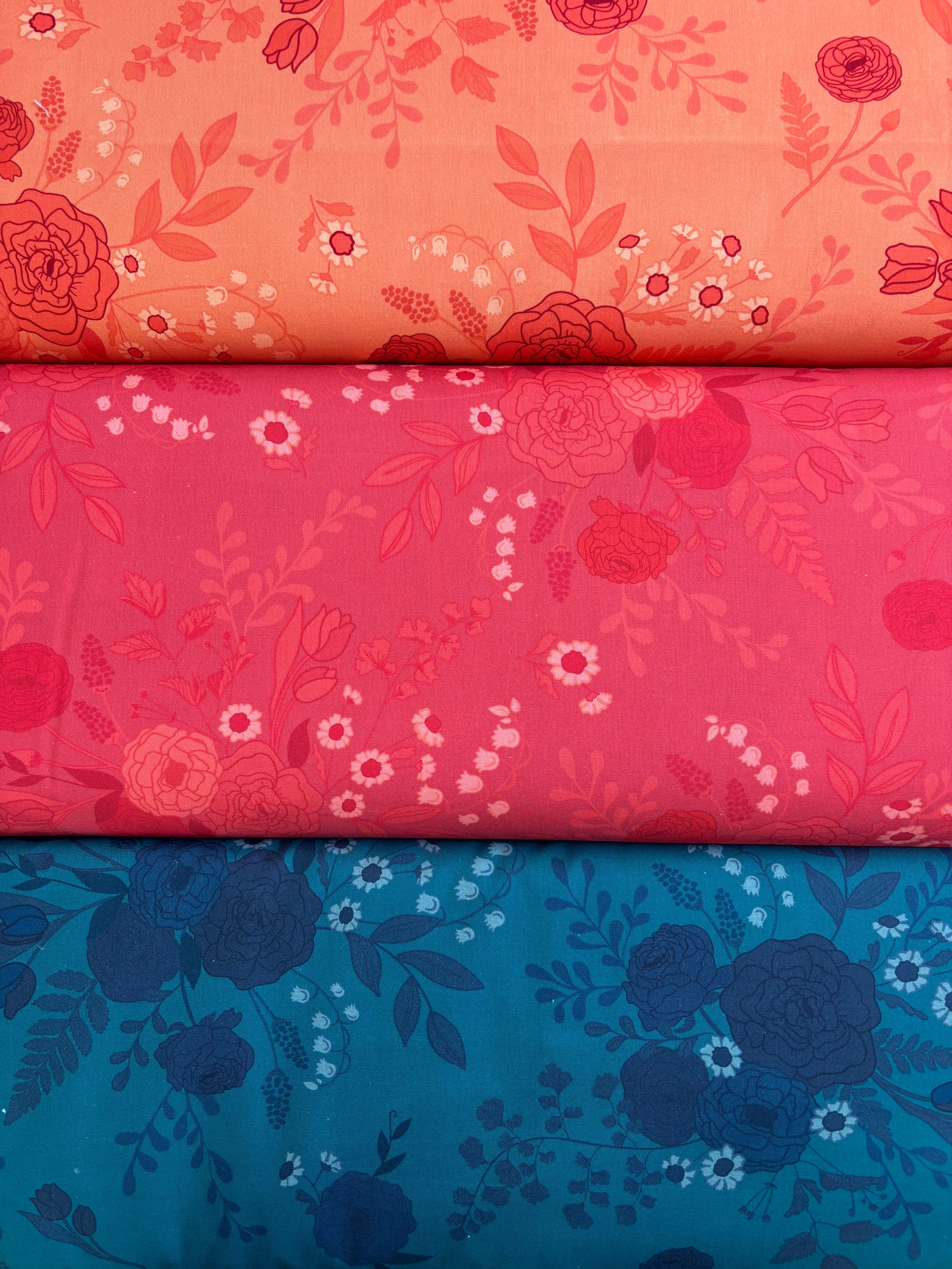 Add one of the 108" wide backings from the First Blooms collection for an additional $28.50 (1.5 yards included. The piece will be 54" x 108", so there will be some leftover). Please see the photos to see the color options of denim, berry and coral. Please note in the comment section of the order form which color you would like.